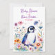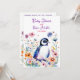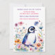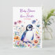 A cute baby penguin surrounded by pink, blue, orange and purple flowers watercolor illustration girl's baby shower invitations.