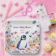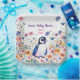 A cute baby penguin surrounded by pink, blue, orange and purple flowers watercolor illustration girl's baby shower personalised paper plates.