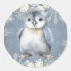 This design features a watercolor baby penguin portrait with blue snowflakes.