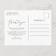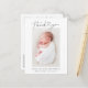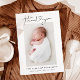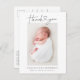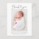 This stylish and elegant photo birth template announcement postcard features a photo of your newborn baby boy or girl, custom message that can be personalised, hand lettered typography text that says "Thank you" with a heart between the words. Add your newborn baby's name, birth stats, and the parents' names. The message on the back thanks the friends and family for the support and gift.