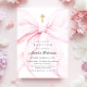 Coquette baptism invitation that features an elegant pink bow and a gold cross.