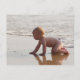 A cute picture of a baby crawling on the sand on the beach, enjoying the waves of water splashing.