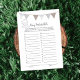 A fun game for the gender reveal party is the Baby products abc's game. This game features a silver grey and brown banner at top and a sitting baby elephant. On the reverse is a smiling baby elephant with its trunk lifted upward with templates.