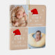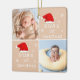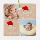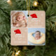 Baby`s First Christmas 2 Photos Santa Hat Snowflake Beige Ceramic Ornament. Cute baby's first Christmas design with a red Santa hat, snowflakes, a baby name in a white script a baby photo - personalise with your baby`s name and photos.