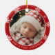 Commemorate a cherished milestone with this sweet and festive Baby’s First Christmas ornament. Designed in classic holiday style, this round photo ornament features a bold red background adorned with delicate white snowflakes, framing your little one’s photo in a heartwarming and memorable way.