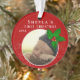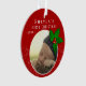 Baby`s First Christmas Red Holly Berry Photo Ornament. Holly berry plant with a custom photo of a baby in a circle frame. The background is red with white spots. Add your photo and customise the name and the text and make a sweet family keepsake.