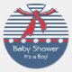 Ships ahoy for a new baby boy with this adorable design. Navy and white sailor suit with red and white collar and tie, and cute buttons. Customisable text. Baby shower invitations, thank you postcards, buttons, keepsake ornaments, stickers and more! PinkInkArt original.