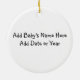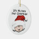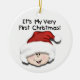 A baby dressed in a Santa stocking cap and kid style text that reads "It's My Very First Christmas!" on first Christmas customisable keepsake ornaments.