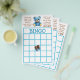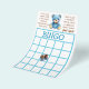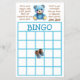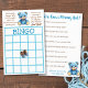 Double sided flyer with two baby shower games, BINGO and Who Knows Mommy Best. Cute blue and brown colors with a crochet bear for a boy's baby shower.