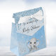 For an elegant, glamourous and girly style baby shower celebrating a baby boy. A light blue gradient background. Decorated with faux glitter drips, glitter spots and a cute elepahant baby boy. With the text: Baby Shower with a modern dark grey coloured hand lettered style script. Template for the mum to be's name.
