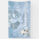 For an elegant Baby Shower. A light blue faux metallic looking background. Decorated with faux glitter drips, paint dripping look,glitter dust, blue and silver coloured balloons and a baby elephant. Personalise and add the name. Perfect both as a welcome banner or as party decor.