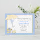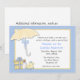 Baby shower invitation in blue and yellow with umbrella, gift and rubber ducky. Invitations are easy to customise and come complete with envelopes and your choice of paper.