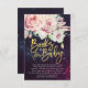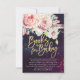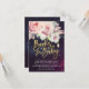 Elegant Watercolor Natural Boho Floral Feather and Gold Handwritten Script on Purple Sparkle Bokeh Lights Background.