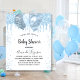 For a baby shower, celebrating a baby boy. A chic white background. Decorated with blue faux glitter drips, paint dripping look and blue and silver coloured balloons. Personalise and add the name of the mum to-be's name and party details. The name and the text: Baby Shower are written with a hand lettered style script