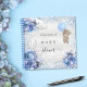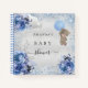 A faux silver metallic looking background. Decorated with a teddy bear baby boy holding a balloon, blue faux glitter dust and florals. Personalise and add a name.