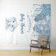 For an elegant Baby Shower. A chic white background. Decorated with faux glitter drips, paint dripping look,glitter, party streamers, blue and silver coloured balloons and a cute elephant baby boy. Personalise and add the name and a date. Can be used as a welcome banner, wall decor for the baby shower or as a photo backdrop.