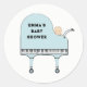 Baby boy shower gift stickers, envelope seals and party favour labels featuring music themed blue baby grand piano resembling a stroller.