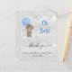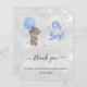 A faux silver metallic looking background. A teddy bear holding a blue balloon stars and faux glitter dust. Personalise and add name(s) and a date on front. The name and the text: Oh Boy! are written with a hand lettered style script
