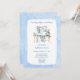 Adorable baby shower invitation for a baby boy featuring a teddy bear theme with hanging baby clothes on a clothesline. Soft blue tones, cute baby essentials, and sweet teddy bear accents make this invite perfect for welcoming a little bundle of joy.