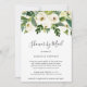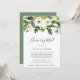 Elegant floral baby shower by mail invitation featuring a top border with hand painted watercolor white roses and greenery. The backside is a matching shade of green. This invitation is great for a baby shower when you cannot get together in person.