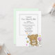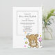 A cute gender neutral long distance baby shower by mail postcard invitation with a whimsical teddy bear with rattle, accompanied by a whimsical typeface text on a pale mint green banner. A great choice for those who can't be there, but want to participate in helping give your baby a great start in life. Customise with your information and due date month.