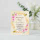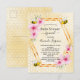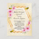 Elegant, fun baby shower by mail invitation, celebrating a baby gir.. Yellow, white background with a honeycomb pattern. With a faux gold geometric frame. Decorated with light pink tropical florals flowers, hibiscus, happy bumble bees and an envelope. With the text: Baby Shower by mail and the name om the mummy to bee on front written with a modern hand lettered style script.