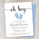Cute budget-friendly baby boy shower by mail invitation with "oh boy" in a stylish script with swashes and a pastel blue watercolor of baby feet. Underneath you can easily personalise the shower by mail details.