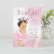 Girl baby shower by mail invitation with adorable brunette princess baby girl wearing a frilly pink tutu and silver crown with a string of pearls on a beautiful pink and silver background. This mail baby shower invitation is easily customized for your event by adding your details in the font style and color and wording of your choice.