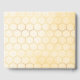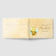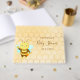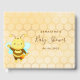 Elegant, fun summer baby shower celebrating a baby girl or gender neutral. Yellow, white background with a honeycomb pattern. Decorated with a cute, happy smiling baby bee holding a rattle. With the text: Baby Shower written with a modern hand lettered style script. Template for the the mummy to bee's name. Brown letters.