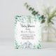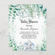 For a baby shower, celebrating a baby boy. A white background. a cute little baby elephant boy and eucalyptus greenery and green sparkles. Personalize and add the name of the mom to-be's name and party details. The name and the text: Baby Shower are written with a hand lettered style script