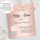 For a baby shower, celebrating a baby girl. A blush, rose gold faux metallic looking background. Decorated with faux glitter dust, and a cute little baby elephant girl in a hot air balloon. Personalise and add the name of the mum to-be's name and party details. The name and the text: Baby Shower are written with a hand lettered style script