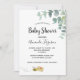 Gender neutral, for a mum, mother to bee. A chic white background. Decorated with white eucalyptus greenery, leaves and sprigs, and a cute happy smiling bee carrying an envelope. Personalise and add a name and party details. Black letters. The text: Baby Shower and the name of the mum to bee are written with a modern hand lettered style script.
