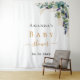 A chic white background. Decorated with green watercolored eucalyptus leaves, sprigs, greenery and a faux gold leaves. Personalise and add the name of the mum to be and a date. Black and golden letters. Can be used as a baby shower welcome banner, as party wall decoration or as a photo booth backdrop.