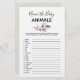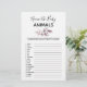 This Purple Watercolor Flowers Baby Shower Name The Baby Animal game has a list of animals and a space for your guests to write on. Ask your guests to write the proper name for the animal’s baby opposite the animal name. Whoever has the most names correct wins!