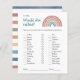 Gorgeous watercolor drawing by Suki's of a boho rainbow in blue, teal terra-cotta, beige grey and brown. Cheerful and fun font in teal for Would she rather game title and charcoal for additional baby shower game details and instructions. Back of baby shower game features a watercolor stripes in the same boho colours as the rainbow in front. Design is part of the Boho Retro Baby Shower Party Supplies and Gifts Collection, which includes baby shower invitations, diaper raffle and book library enclosures, party supplies, decoration and newborn gifts.