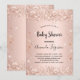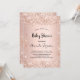 For a baby shower, celebrating a baby girl. A rose gold faux metallic looking background. Decorated with rose gold, pink faux glitter. Personalise and add the mum to-be's name and party details. The name and the text: Baby Shower are written with a hand lettered style script
