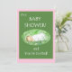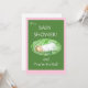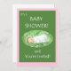 A Baby Shower Invitation card for a new baby girl, with a sleeping baby and white lettering on a dark green background, edged with pink.