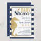 Baby shower invitation with a gold seahorse and starfish with a striped navy blue background. Perfect for a summer baby shower.