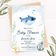 Baby shower invitation baby Shark Theme. This baby shower invite has watercolor illustrations painted by hand, one cute little baby shark, and under-the-sea elements. Perfect for a nautical theme shower party. Part of the text is editable.