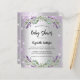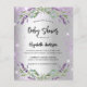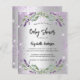 A modern, stylish baby shower invitation. A faux silver looking background with violet faux glitter, sparkles, lavender florals, flowers and eucalyptus greenery. Personalise and add the name and party details.