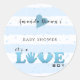 Elegant Baby Shower design with gentle blue and white stripes pattern with light blue glittering confetti dots and a LOVE with baby hand and feet prints in blue, a blue heart and a name calligraphy.