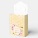 A favour box for a summer Baby Shower, celebrating a baby gir.. Yellow background with a honeycomb pattern. With a faux gold geometric frame. Decorated with pink tropical florals flowers, hibiscus and happy smiling bumble bees. With the text: Thank You and Mum to Bee written with a modern hand lettered style script. Personalise and add the name of the mum to bee's name and the date of the shower. Pink, green and brown letters.