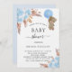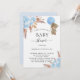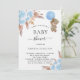 For a modern boho style baby shower. White background. Decorated with light blue florals, roses, pampas grass and a teddy bear boy holding a blue balloon. Personalise and add a name and party details.