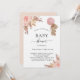 For a modern boho style baby shower. White background on the front. Decorated with rose gold and pink florals, roses, pampas grass and a teddy bear girl holding a pink balloon. Personalise and add a name and party details.