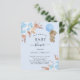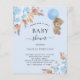 For a modern boho style baby shower. Light blue background colour. Decorated with light blue florals, roses, pampas grass and a teddy bear boy holding a blue balloon. Personalise and add a name and party details.