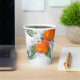 Baby shower paper cup is decorated with an illustration of a delicious tangerine branch with flowers in a watercolor sketch style.