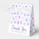 This modern, playful baby shower favour box features "Thank you for celebrating with us" typography in purple along with a cute watercolor pattern in purple, pink and blue.