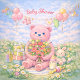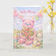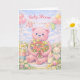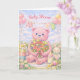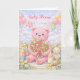 A sweet baby shower card featuring a gentle pink bear holding a bouquet of flowers,