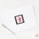 A baby shower sticker featuring an illustration of a pink baby carriage over a background of black with white polka dots. Personalise with your name.