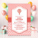 Invite your friends and loved ones with this pink and white hot air balloon baby shower invitation which is decorated with polka dots and chevron stripes.